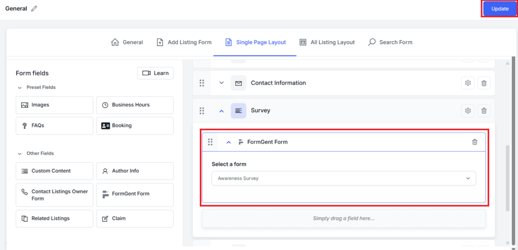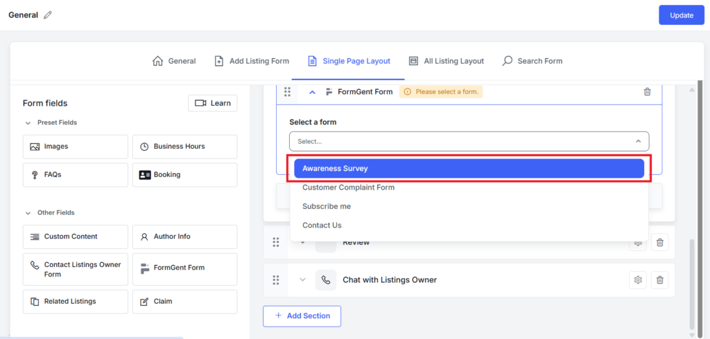 - Make sure the listing belongs to the directory where you added the FormGent form