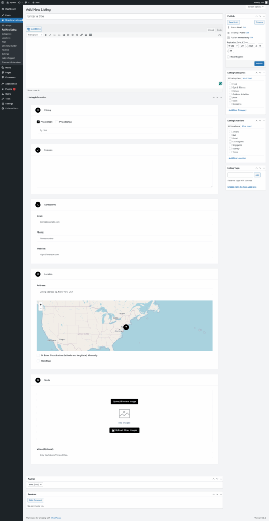 Now, you will be taken to the “Add Listing Page” option to create your first listing. However, if you returned to the WordPress Dashboard, navigate to the Directorist Listings > Add New Listing > Input Listing Data > Publish.