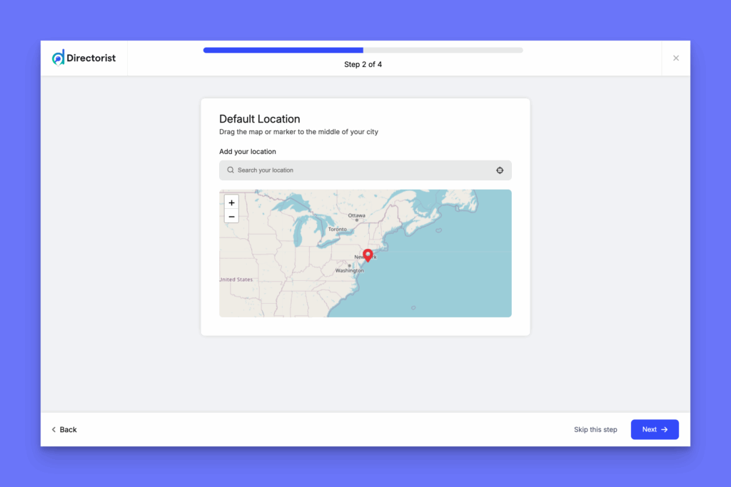 - Step 2: Select a default location by dragging the map marker or entering your city name in the search bar.