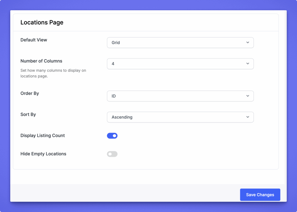 The Locations Page Settings allow you to control how location blocks are displayed and organized on your directory’s Locations page. You can customize the layout, sorting, and visibility of location-based listings.