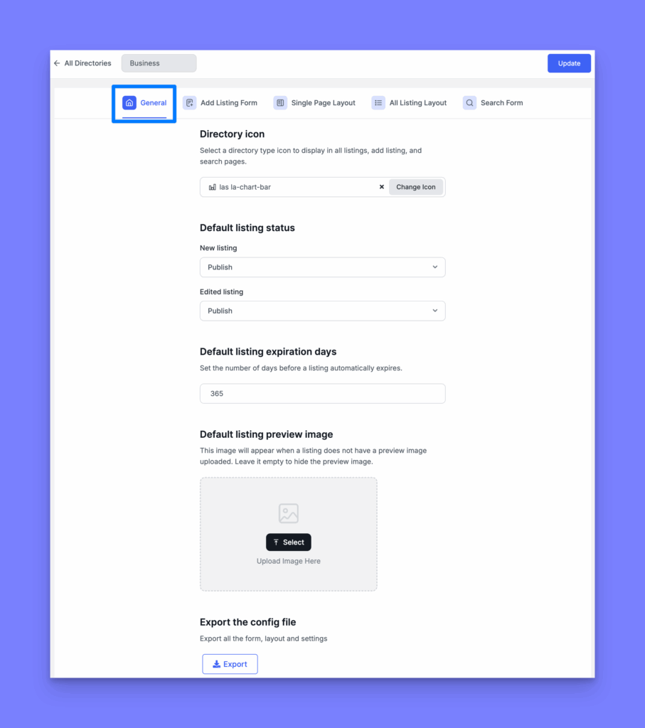 - Export the Config File: Allows you to export the current configuration of the directory (form structure, layout, and field data) as a JSON file. This is helpful for backup or reusing the setup in another directory instance.