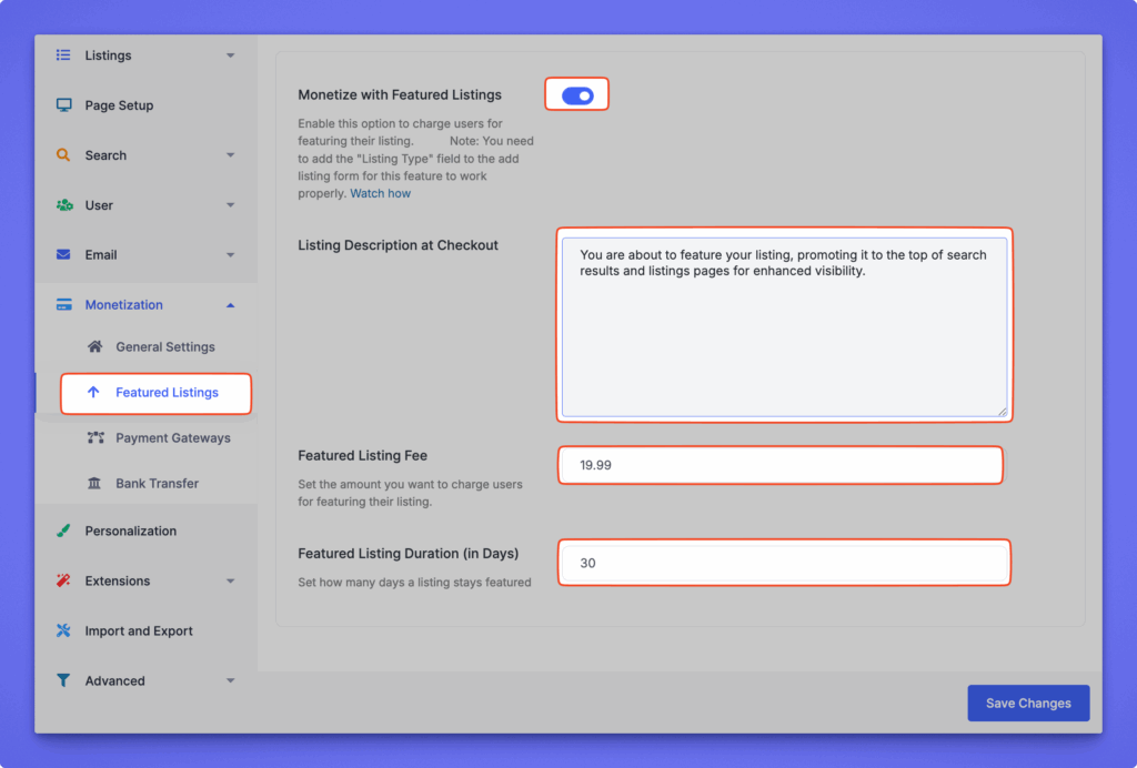 - Toggle Monetize with Featured Listings to ON. This enables paid featured listings on your directory site.