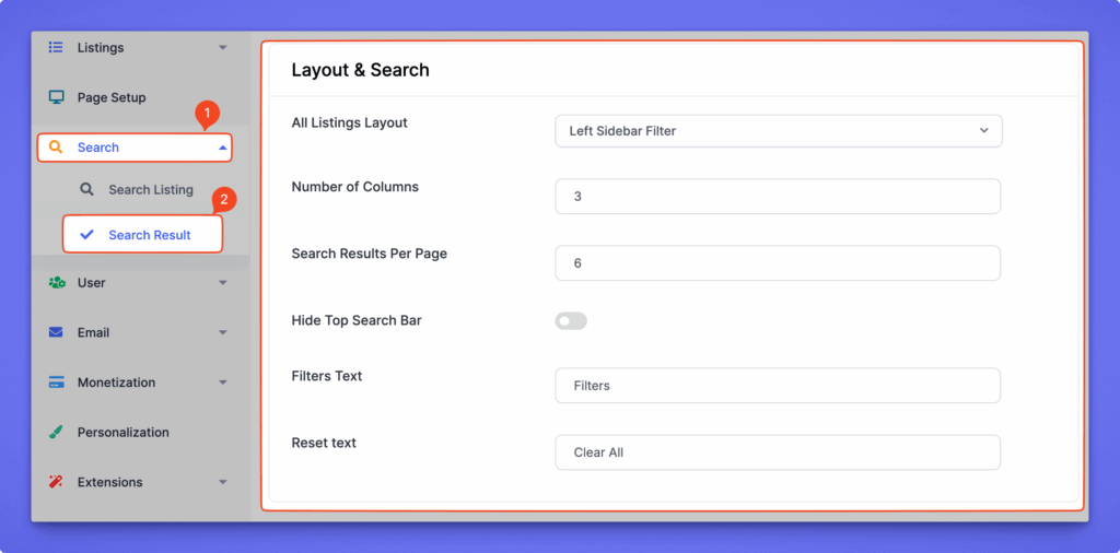 To Access this page: Directorist Listings → Settings → Search → Search Result