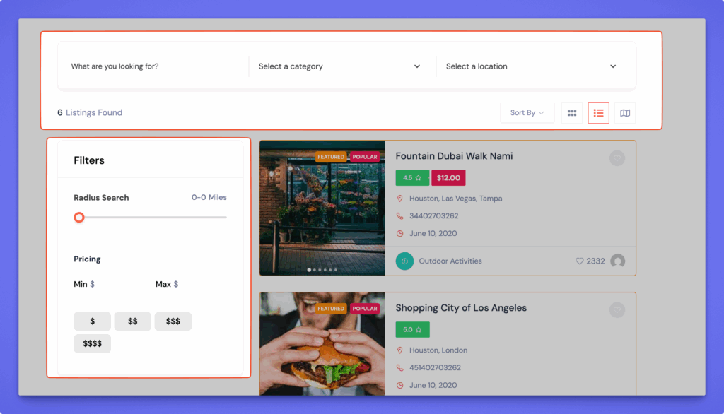 Directorist provides an excellent interface to search all listings. You can display a beautiful search form for searching all listings very easily with a simple shortcode. However, Directorist has added an advanced filter to narrow down the result of listings on any listing archive page.