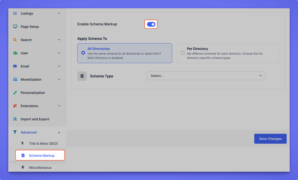 Toggle this option to activate schema markup across your directory listings. Once enabled, Directorist will automatically add structured data (JSON-LD format) to listings based on the selected schema type.