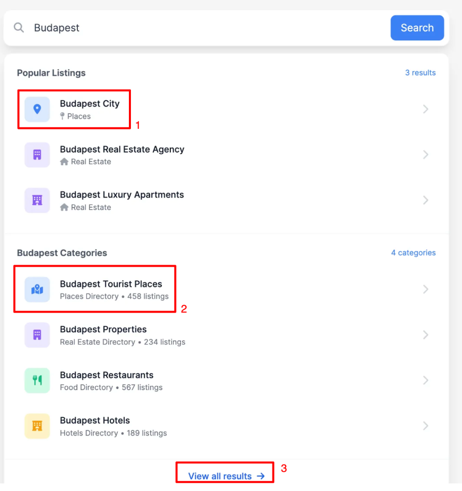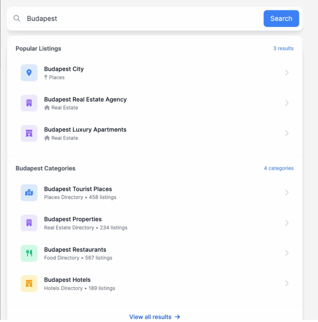 A user types a keyword (e.g., “Budapest”) in the Universal Search form. As they type, dropdown suggestions instantly appear, showing matching listings and categories from different directories