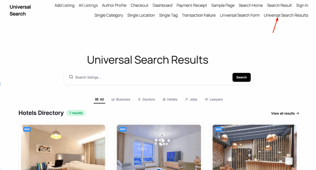 - Universal Search Result – This page shows the combined results, with listings and categories from all directories.