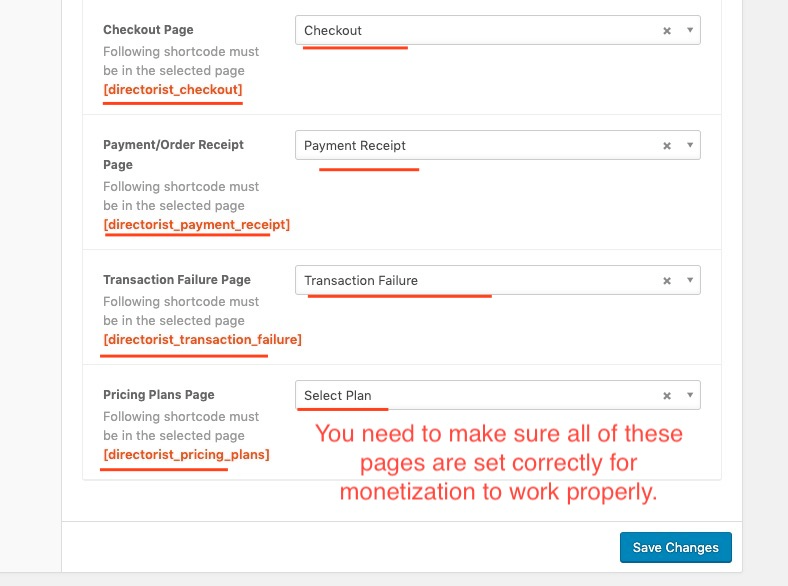 Directorist plugin and the claim listing add-on uses different pages with some specific shortcodes to function properly. You need to make sure all the pages are set properly in the settings. The directorist plugin and this add-on should create all the required pages automatically for you and you just need to assign them to the settings if they are not already assigned. However, if the page is not created/you have deleted before, then do not worry. You can create those pages manually and put the shortcode inside each page. All required shortcodes and other information are clearly mentioned in the settings page. Please go to Directory Settings > Pages, Links & Views Page. And make sure the following pages are set properly. You need to assign those pages for charging your users/business owners for claiming a listing.