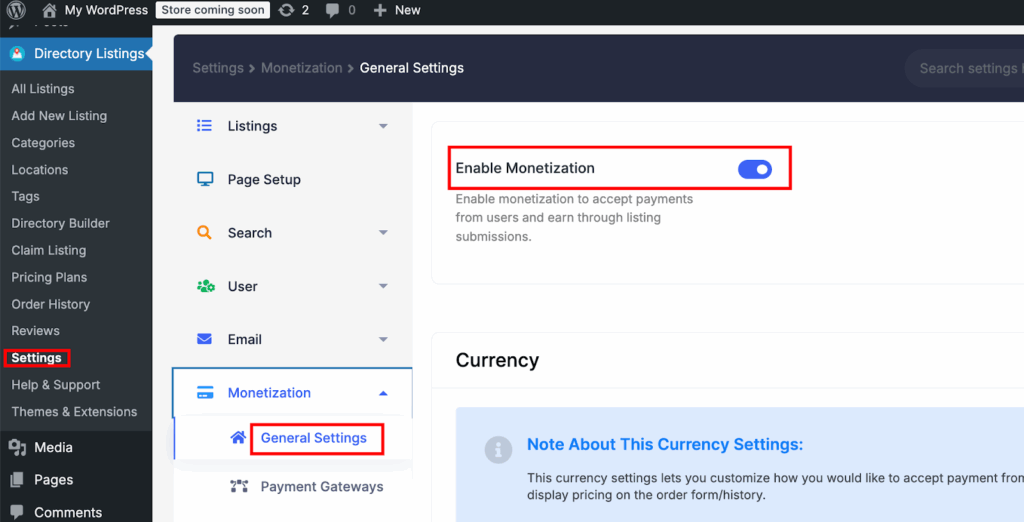 A claim for a listing can be either for free or paid. In order to enable paid listing and pricing plan etc. to work, you need to enable monetization first. Go to Directory Settings > Monetization Settings and Set ‘Enable Monetization Feature’ to Yes.
