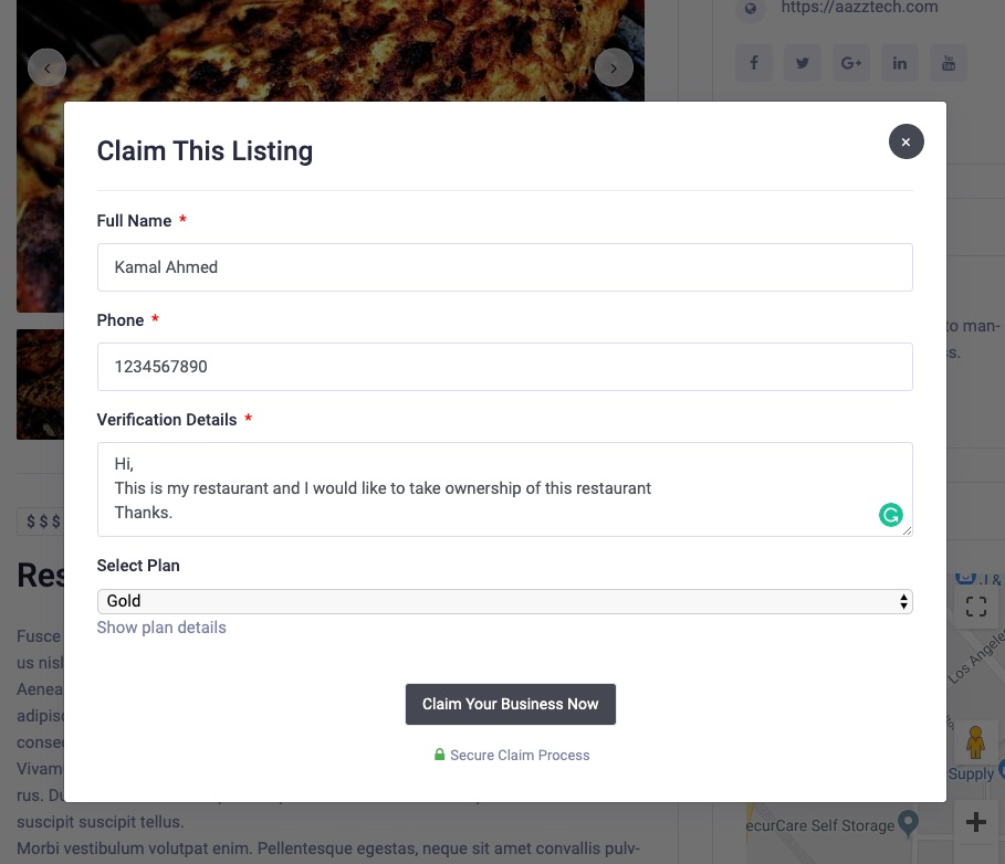 Claim Modal Form on front-end user will be required to fill up all the fields in the claim form. if you have assigned a pricing plan as a method of charge for a claim for this listing then business owner will be able to choose a plan before claiming his business. The next step is to moderate the claims received from a business owner.