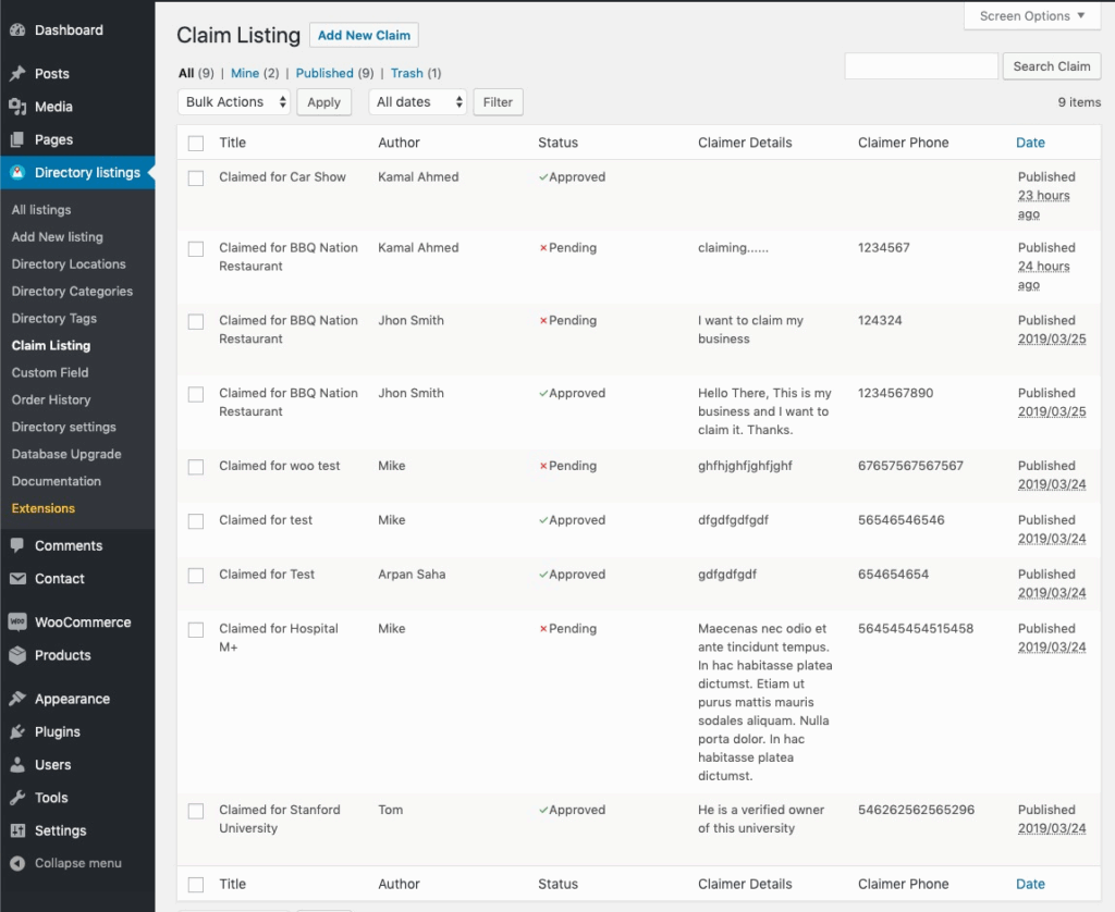 You can moderate claims very easily from a simple user interface. You will see all the claims received from different business owners on the Directory Listings > Claim Listings page.