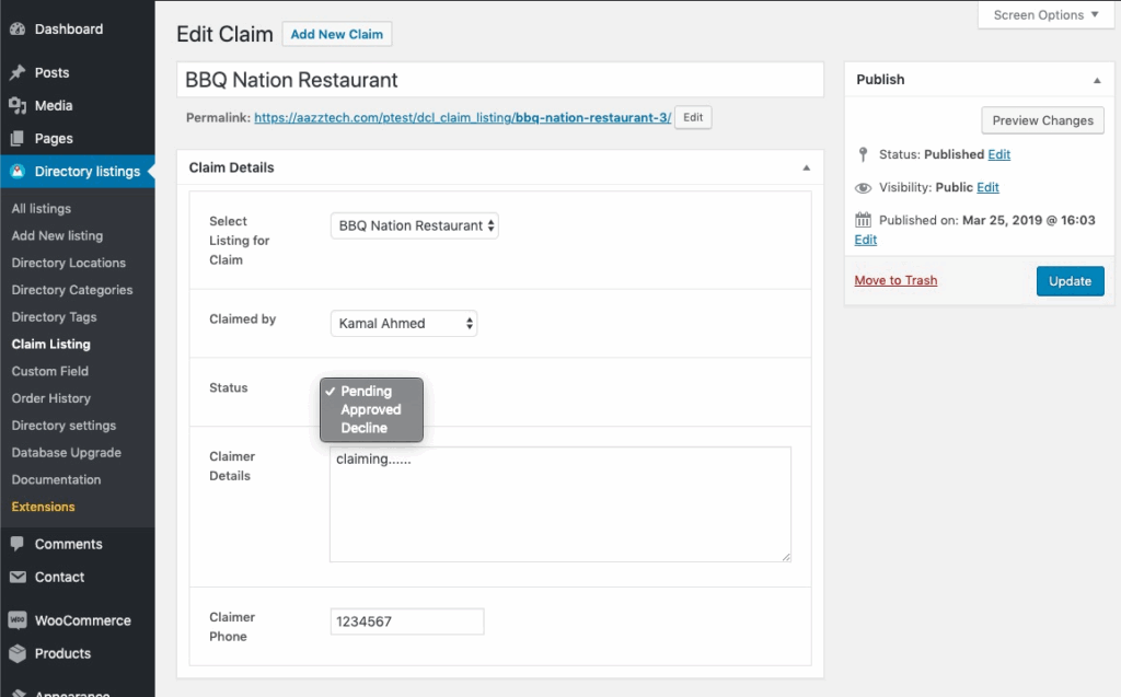 Go to Directory Listings > Claim Listings and hover on any claim and click on the edit link. You will see the edit claim page like below.