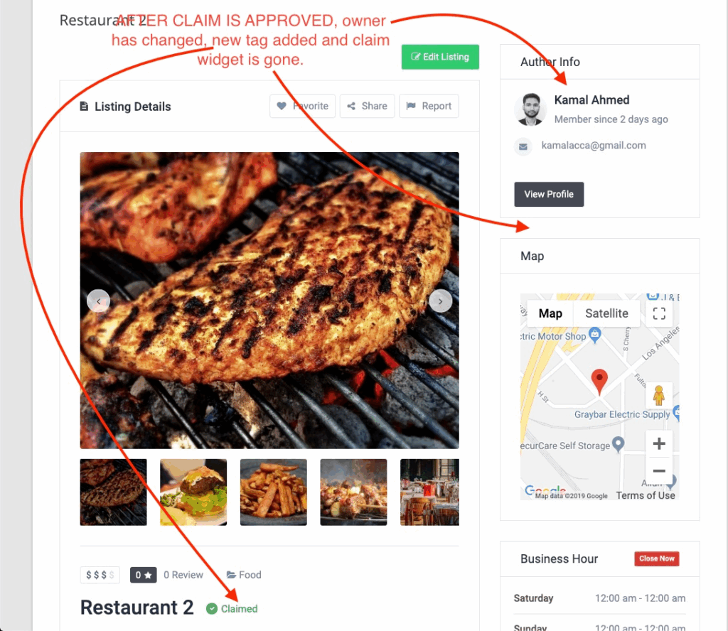 Claim View or Moderation UI Review the claim details and choose a listing status eg. approved or decline and update the claim. Both admin and claimer will get a notification of the claim’s status via email. If you approve the claim, claimer will be the new owner of the listing and a new badge will be added to the listing. See the images below for some visual ideas how claim status works and how it affects a listing. Before a claim is approved for the following listing.