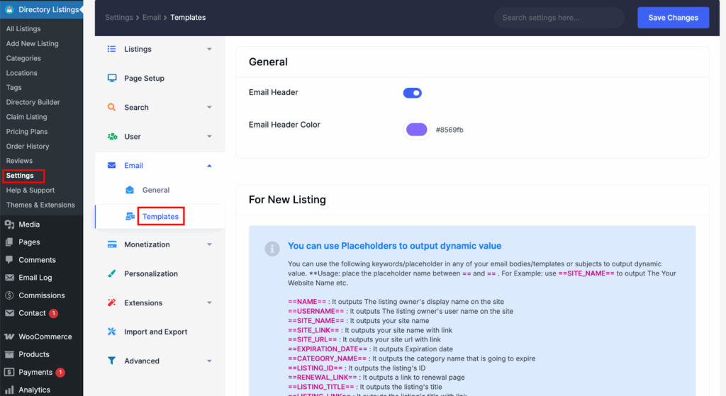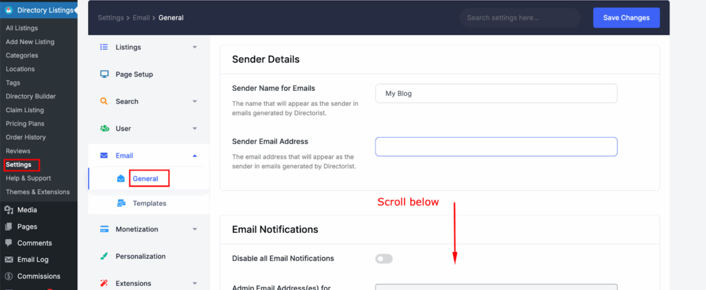 When a claim is made or a claim status changes, both the admin and the claimer receive notifications. You can edit those notifications very easily. Please go to Directory Settings > Email Settings. You can customize the general settings of email notification under the “Email General” tab.