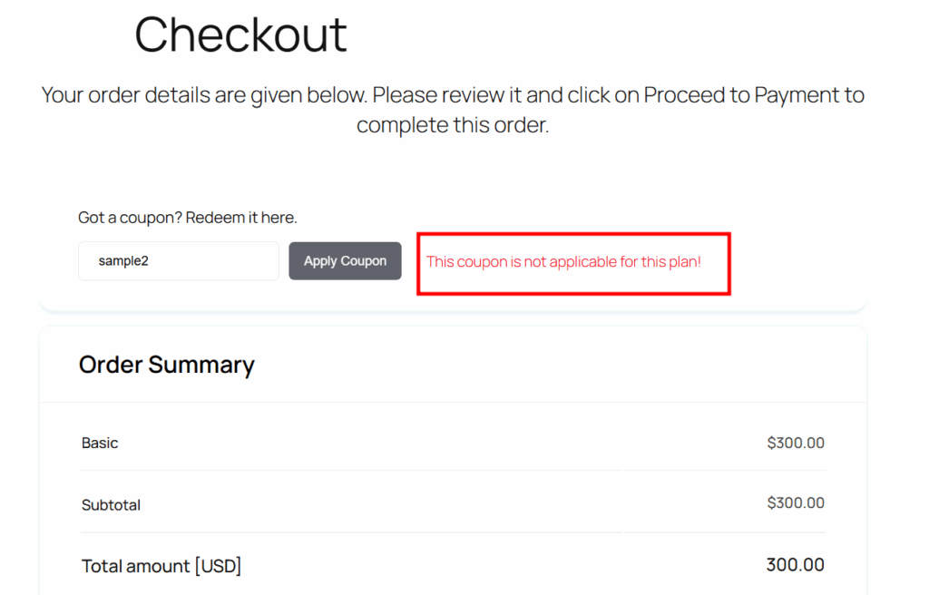 - If a user tries to apply the coupon on a plan that has not been selected, the system will not allow it.