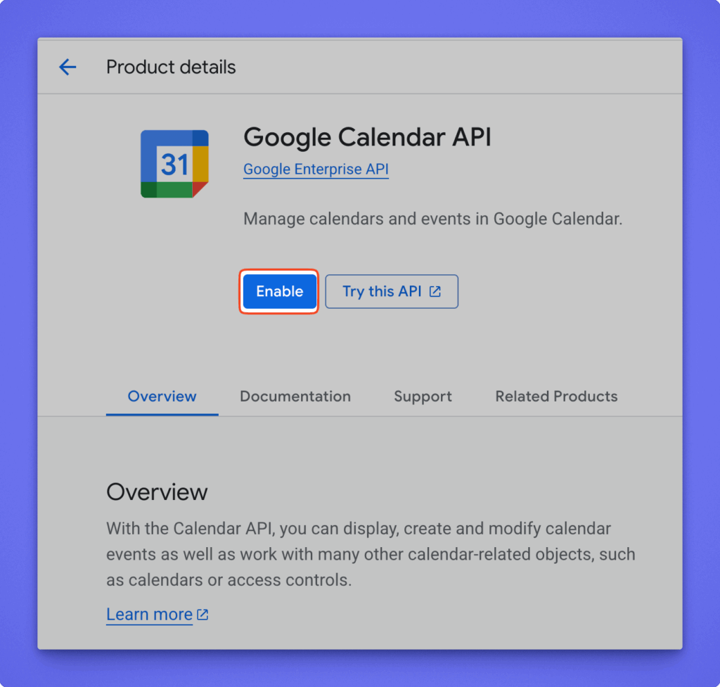 - Enable the Google Calendar API: