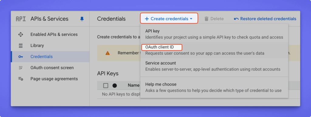 - Go to APIs & Services → Credentials → + CREATE CREDENTIALS → OAuth client ID