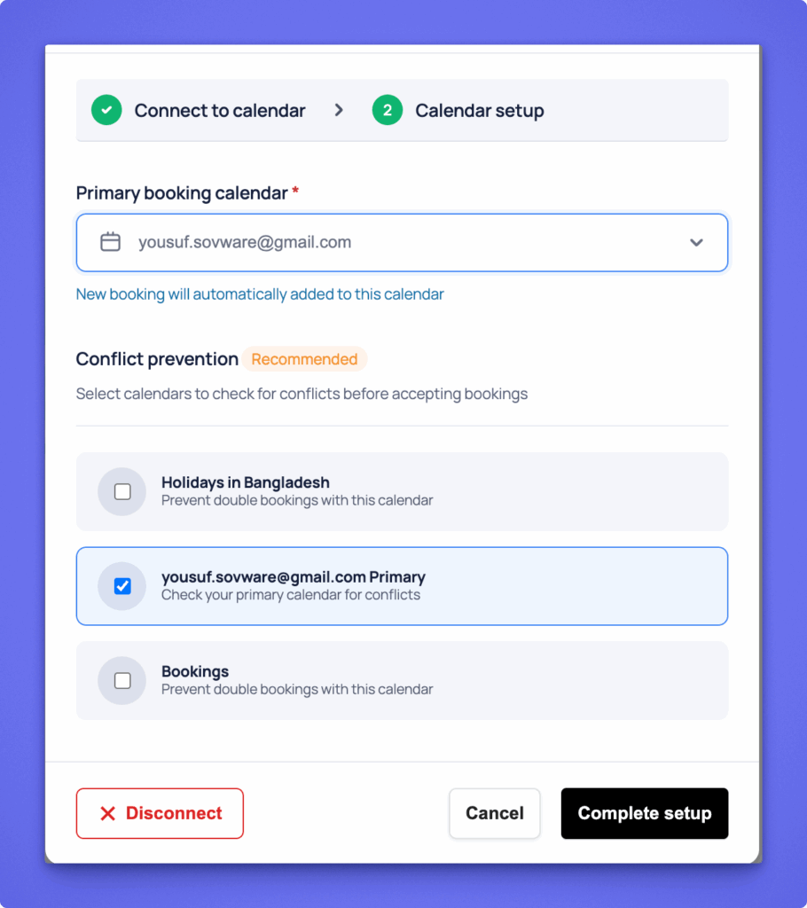 - Open the Booking Dashboard and click Connect Google Calendar (Step 1 modal).