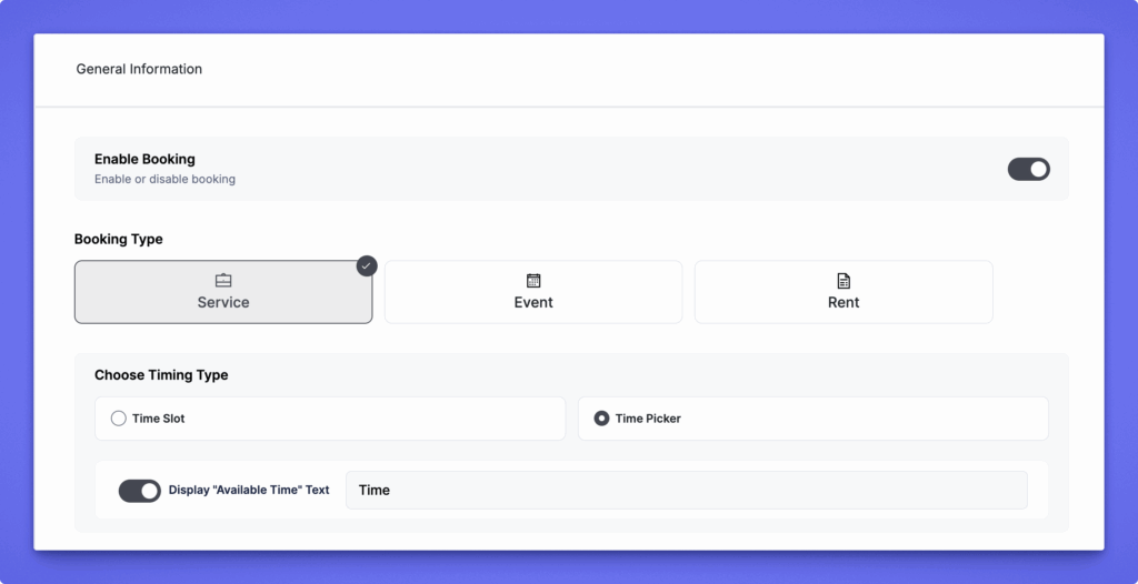 Choose Service as the booking type to access the fields shown in this section. Other types—Event and Rent—have their own separate configuration.