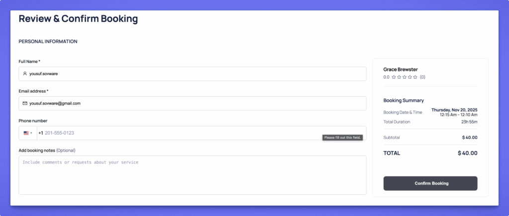 The user clicks Confirm Booking to complete the reservation. Based on your settings, the booking is either confirmed instantly or sent for manual approval.