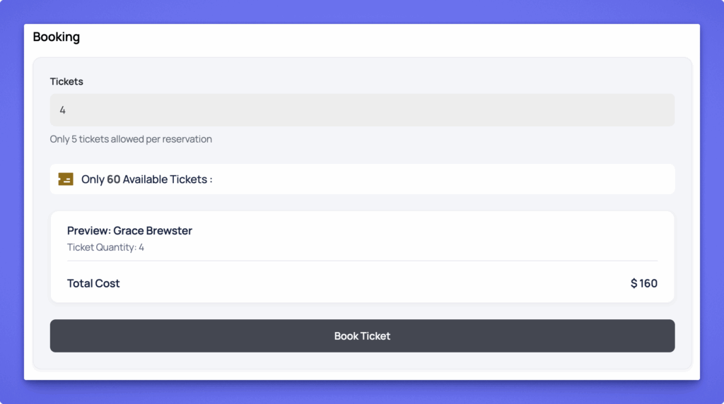 Users can book an event by selecting the number of tickets they want, reviewing the total cost, and clicking Book Ticket to complete the reservation.