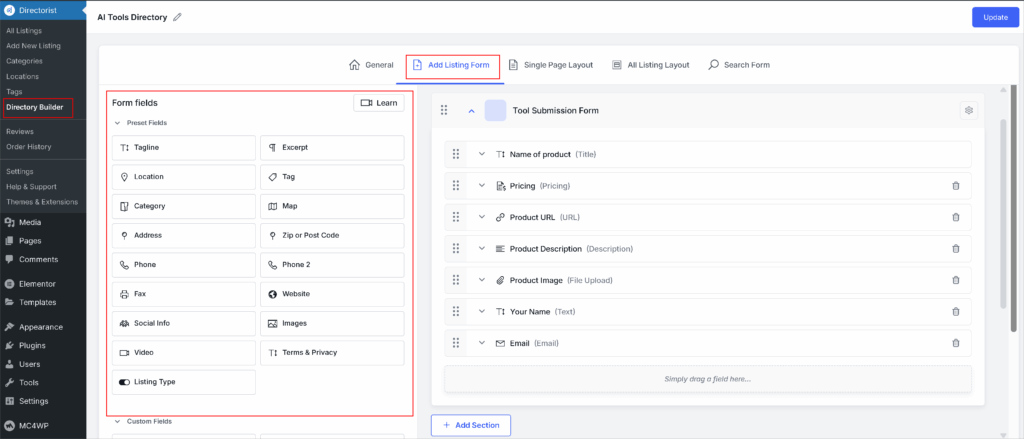 To create a submission form, follow the process: Directorist→ Directory Builder→ Add Listing Form. Use the “Form Fields” to customize the form.