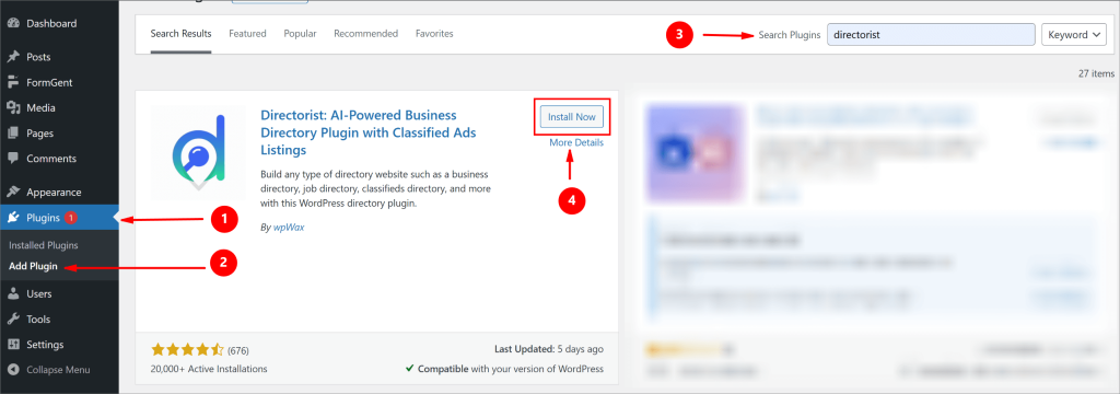 Start by installing the directory plugin first. Go to Plugins → Add New in your WordPress dashboard. Search for Directorist, then install and activate it. After activation, Directorist will launch a quick setup wizard to help you configure the basic directory settings.