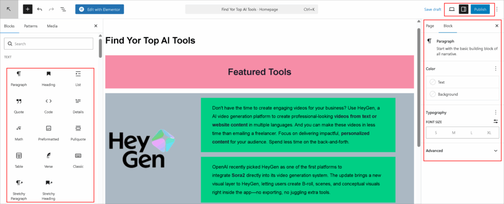 Now it’s time to create the homepage of your AI tools directory. dClassified works smoothly with the WordPress block editor and Elementor, so you can build pages using blocks without any coding.