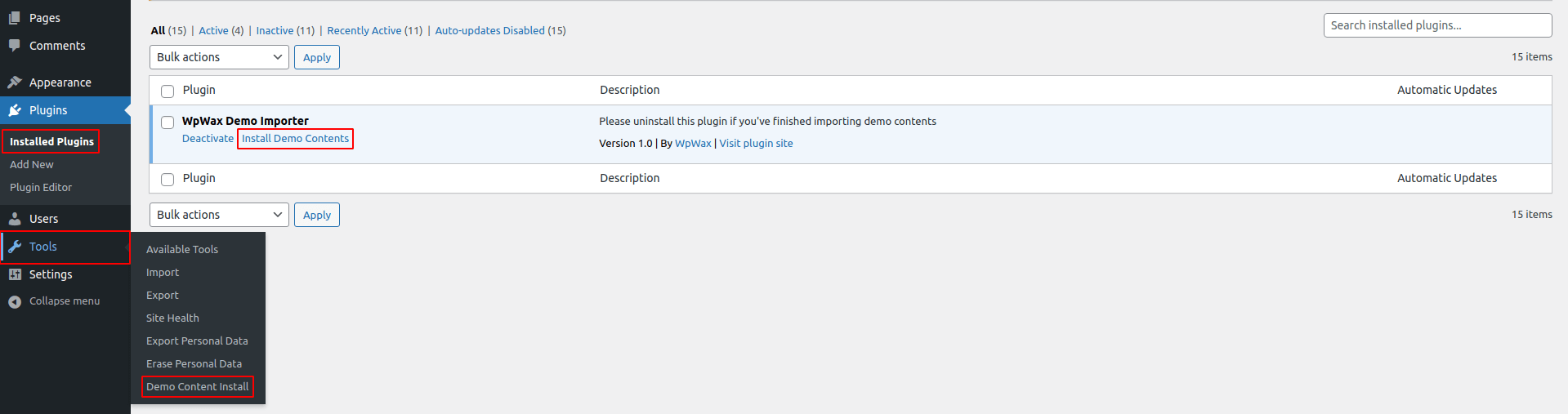 From Admin menu, navigate to Tools -> Demo Content Install. Or alternatively, navigate to Plugins -> WpWax Demo Importer -> Install Demo Contents.