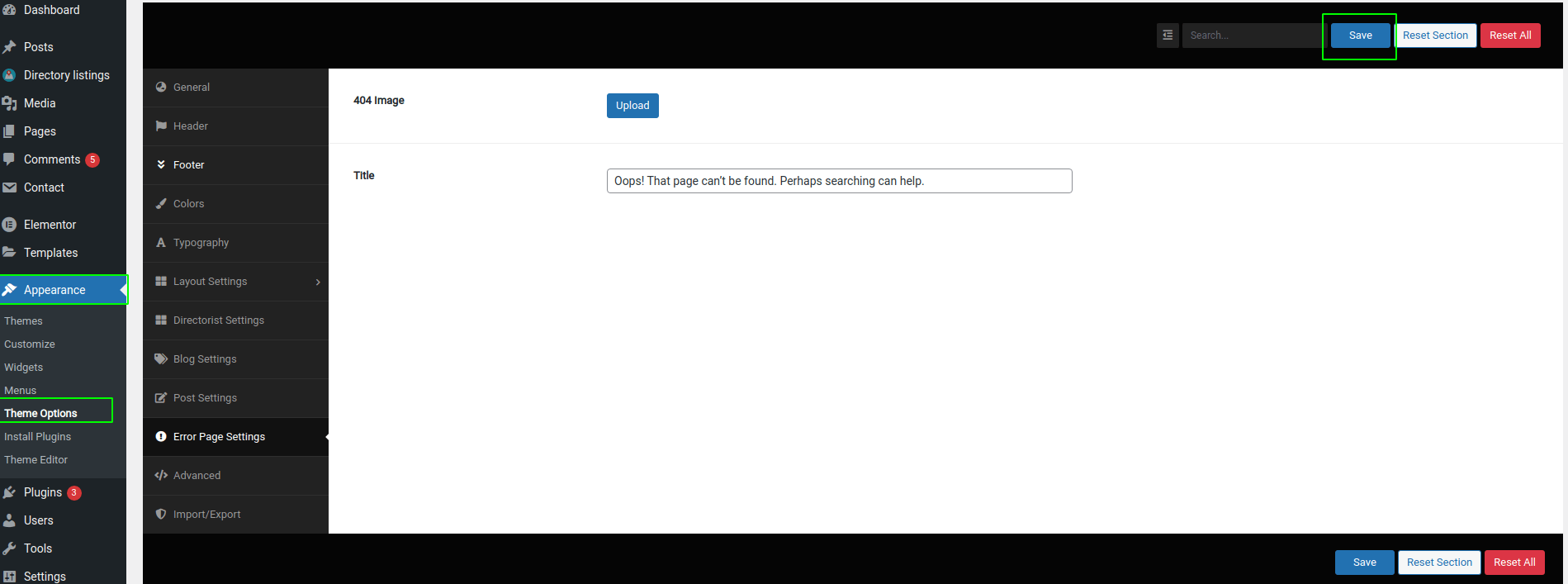Navigate to Appearance -> Theme Options. Then go to the Error Page Settings tab. From here you can change settings for the error page.
