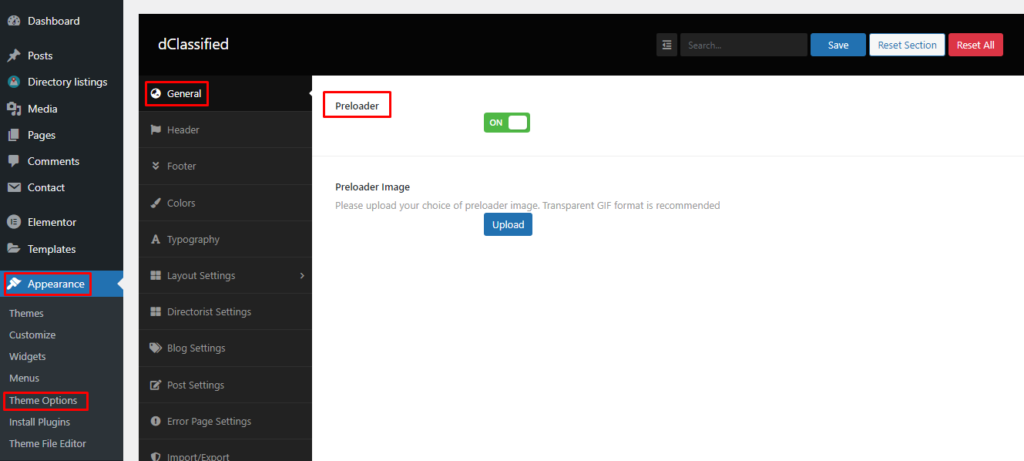 Here you can find the option for enabling/disabling the “Preloader” option. Also, you can upload your custom preloader image. When uploading an image please make sure it’s a transparent GIF image.