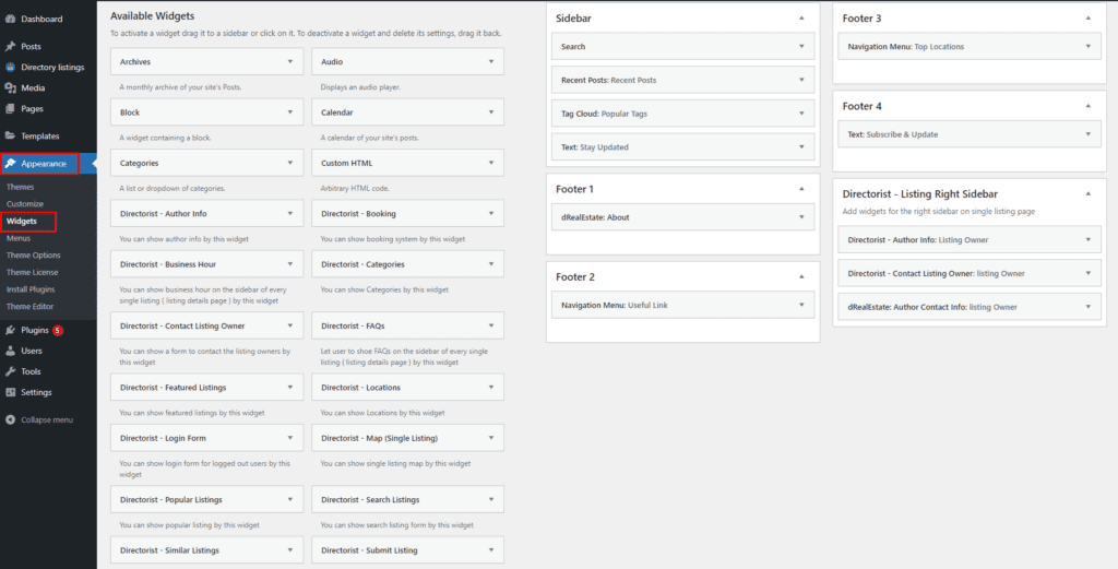 To set up footer widgets, navigate to Appearance -> Widgets. Here you can find available footer widget areas.