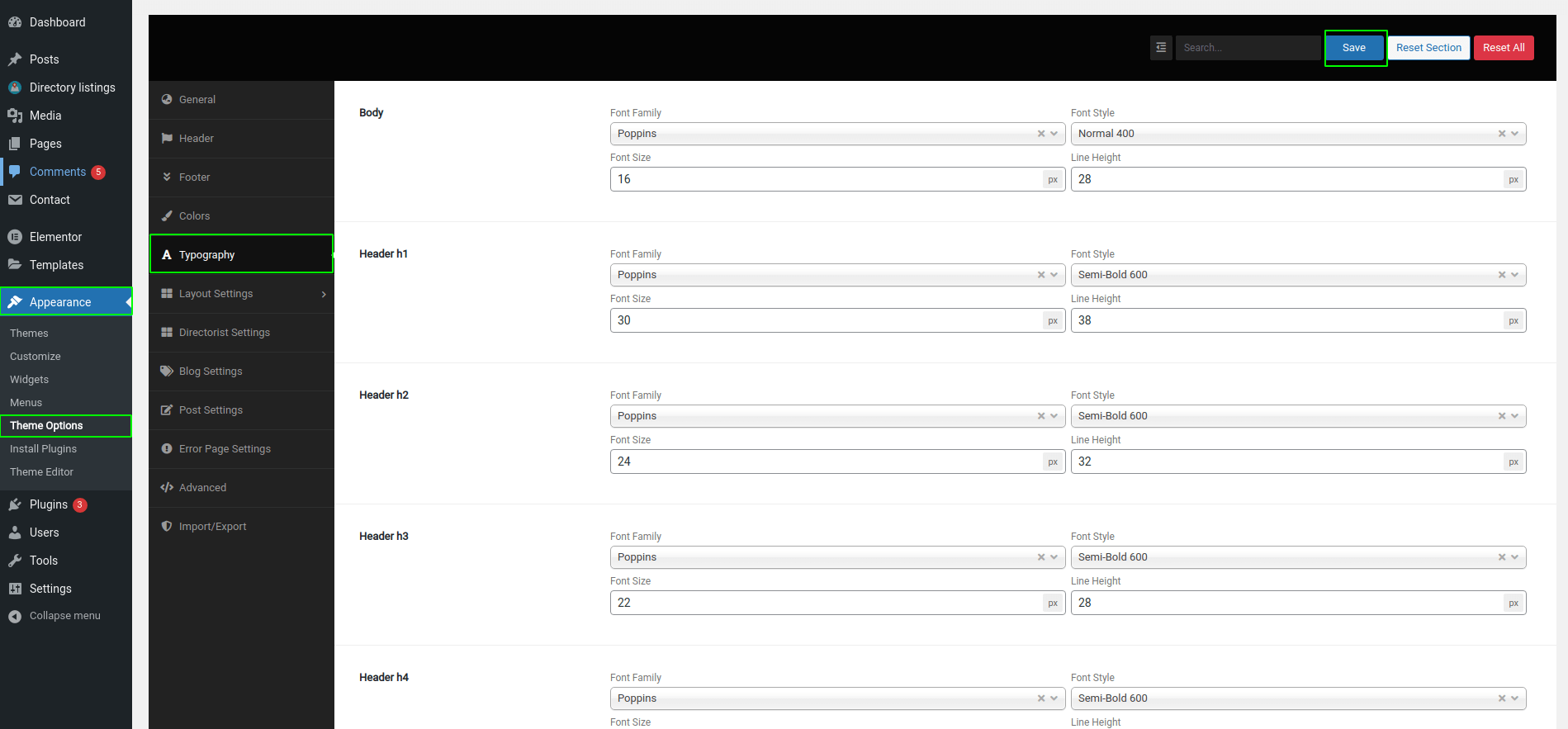After changing the Typography settings, click on the Save Changes button.