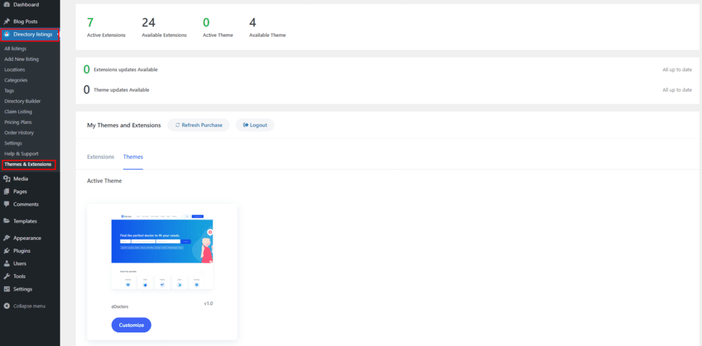 - From WordPress Admin Panel, Navigate to Directory Listings -> Themes & Extensions.