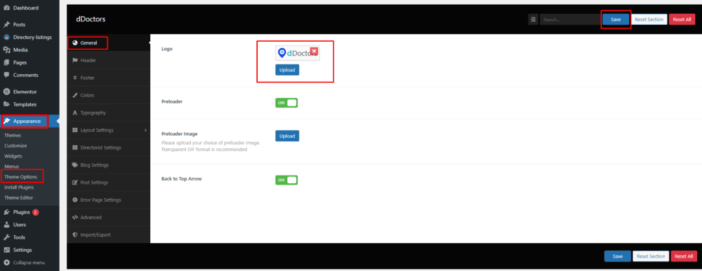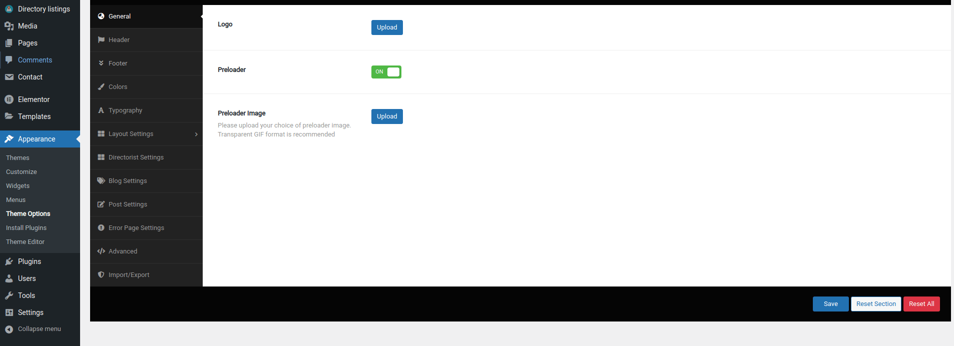Here you can find the option for enabling/disabling the “Preloader” option. Also, you can upload your custom preloader image. When uploading an image please make sure it’s a transparent GIF image.