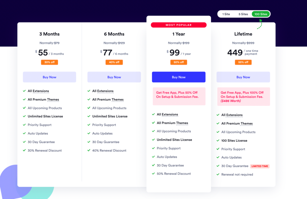 - The lifetime pricing plans include $399, $699, and $999. In lifetime deals, you will get upto 100 domains to register the plugin and get priority support forever up until the product lifetime.