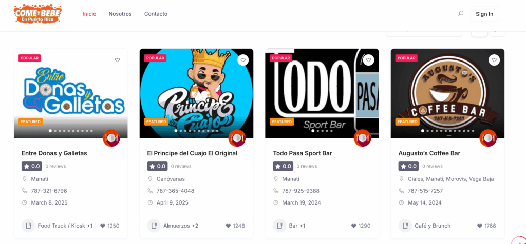 Come y Bebe en Puerto Rico is a food and dining directory that helps locals and travelers discover the best eateries, cafés, bars, food trucks, and gastronomic spots across the island. The platform features hundreds of listings — from restaurants and brunch cafés to pizzerias, kiosks, and dessert shops — organized with intuitive categories, map-based search, filters, and user-friendly navigation. Come y Bebe en Puerto Rico offers a comprehensive and easy-to-use guide to Puerto Rico’s culinary landscape, making it an excellent example of how a niche directory built with a WordPress listing system can serve a community’s needs and tastes.