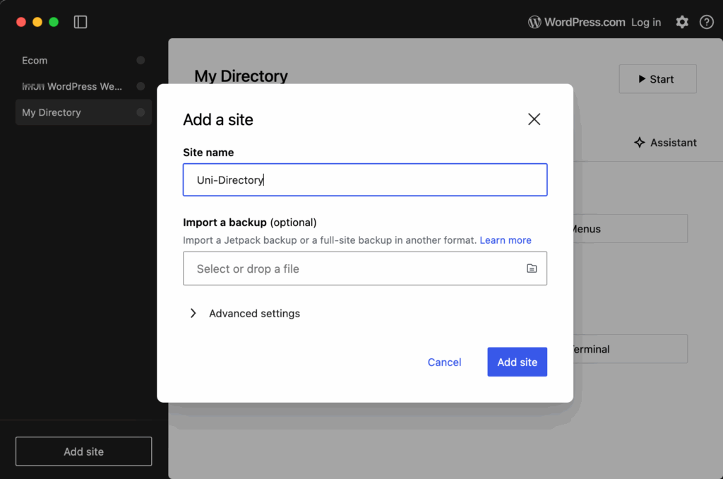 - Run Local → “Create a new site” → pick a name (e.g., uni-directory) → choose Preferred environment (default) → set WP username/password (remember them).