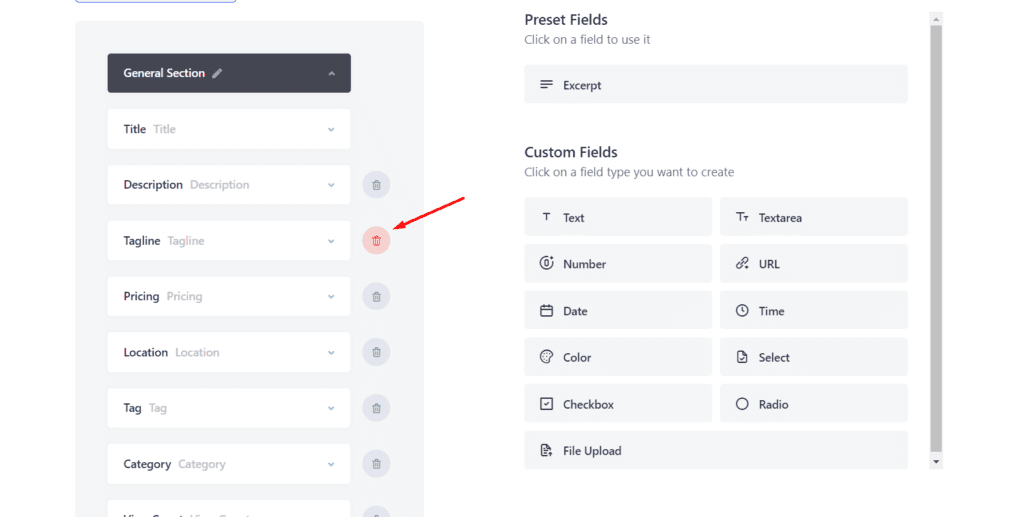 Now, let’s delete the tagline field for example. You can do it either by clicking on the delete sign located on the right side of the field.
