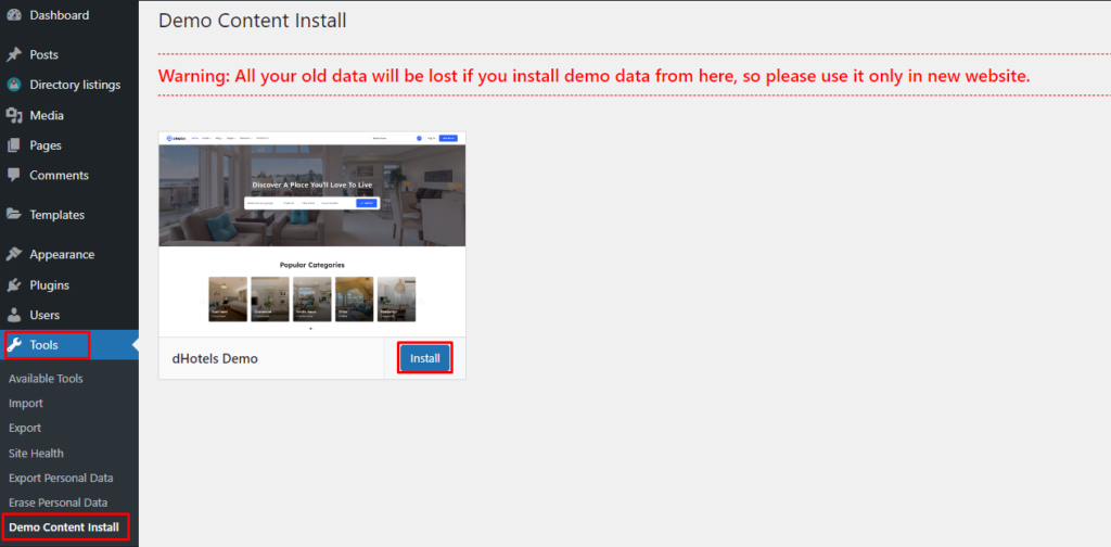 From Admin menu, navigate to Tools -> Demo Content Install. Or alternatively, navigate to Plugins -> WpWax Demo Importer -> Install Demo Contents.