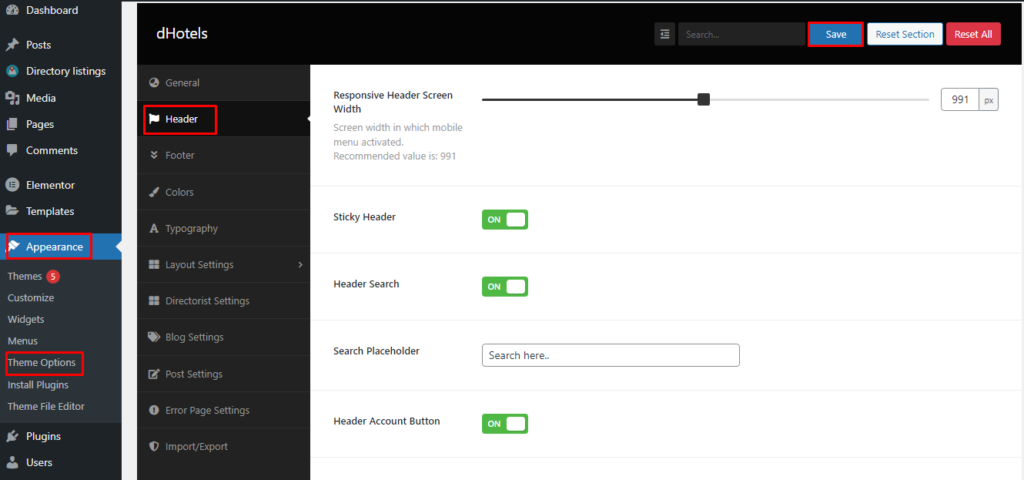 To change the Header related settings, please go to Appearance -> Theme Options. Then go to the Header tab. Following features are available: