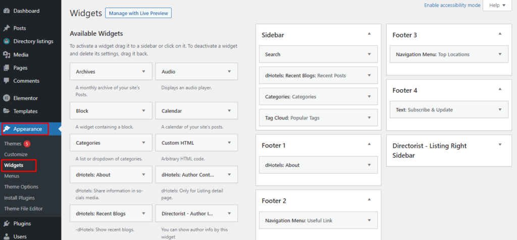 To set up footer widgets, navigate to Appearance -> Widgets. Here you can find available footer widget areas.