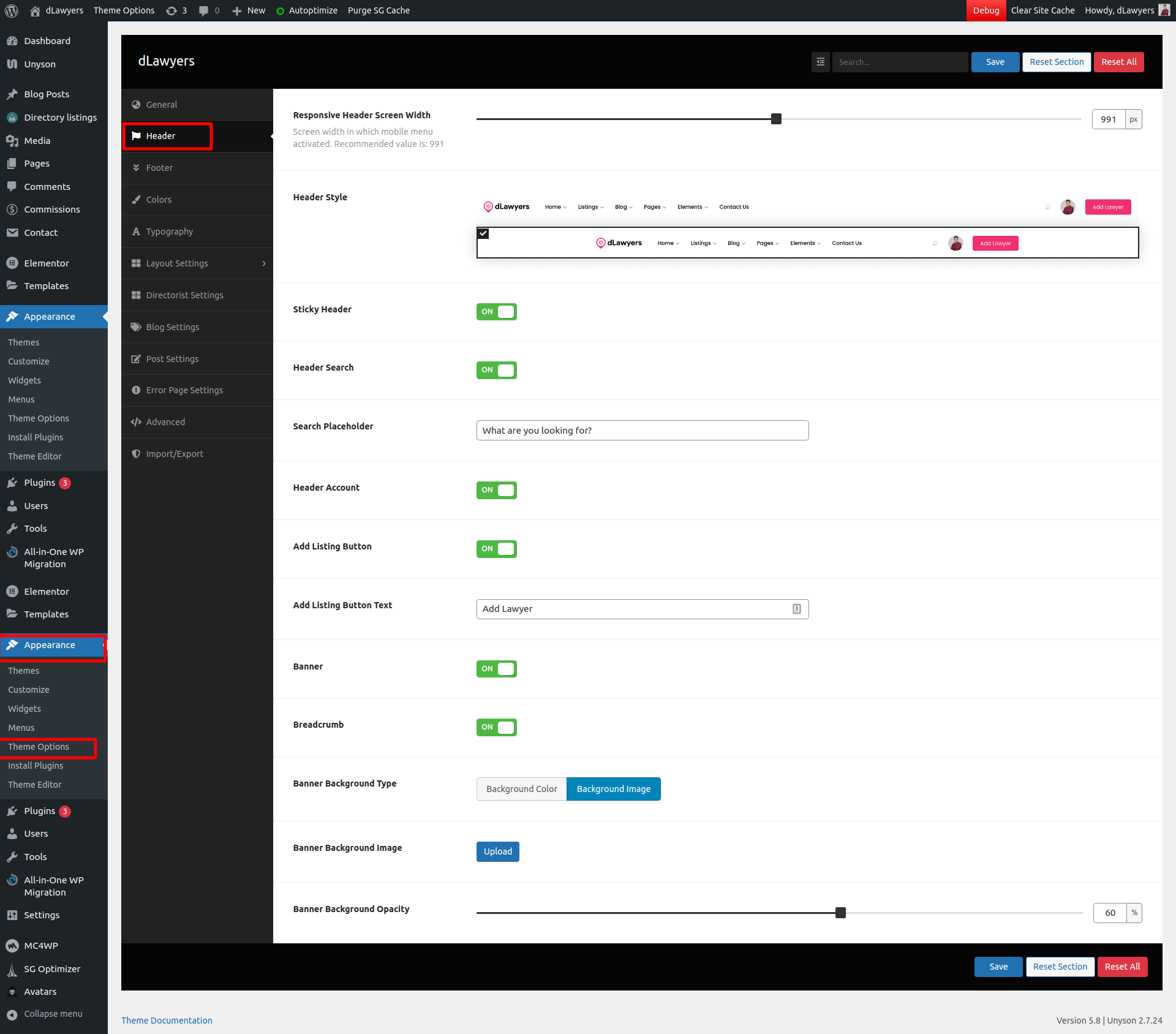 To change the Header related settings, please go to Appearance -> Theme Options. Then go to the Header tab. Following features are available: