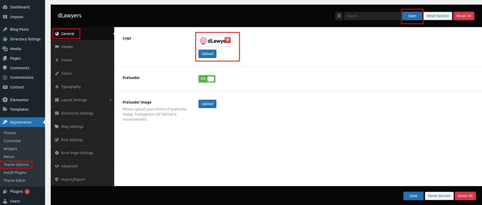 Here you can find the option for enabling/disabling the “Preloader” option. Also, you can upload your custom preloader image. When uploading an image please make sure it’s a transparent GIF image.