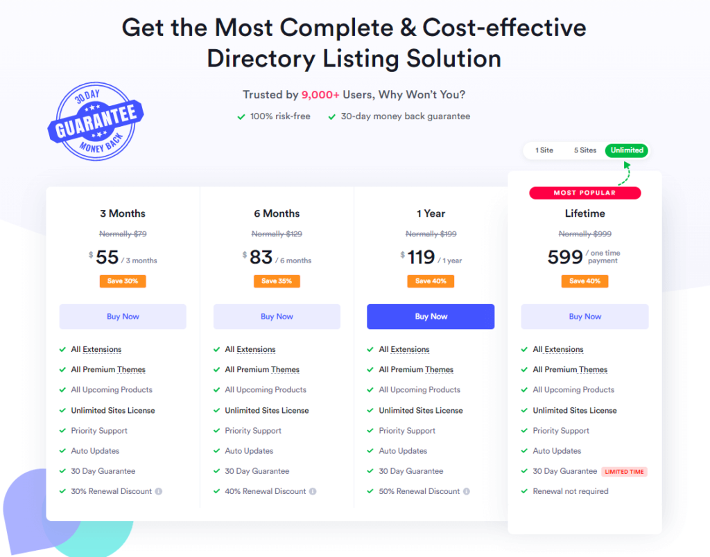 Directorist pro pricing usually starts from just $79 per 3 months. However, you can get it at $55 per month as of now while I’m writing this article. You can also get the unlimited website plan for a lifetime only at $599 (Usually available at $999).