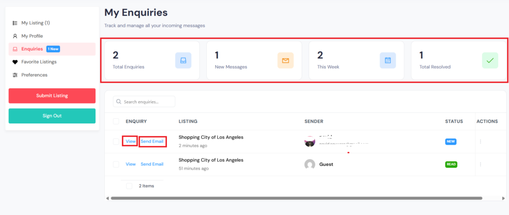 Directory owners get a complete overview of all collected data, while listing owners manage their own enquiries.