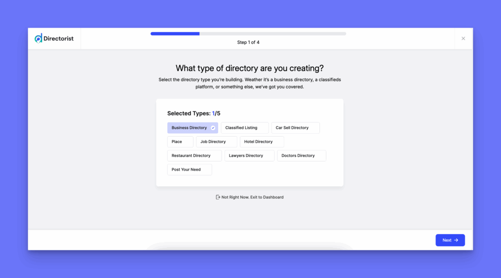 After activation, the Directorist Setup Wizard will launch automatically to guide you through the basic configuration. Alternatively, you can skip it by clicking the “Not Right Now, Exit to Dashboard” button, but it is highly recommended for beginners.