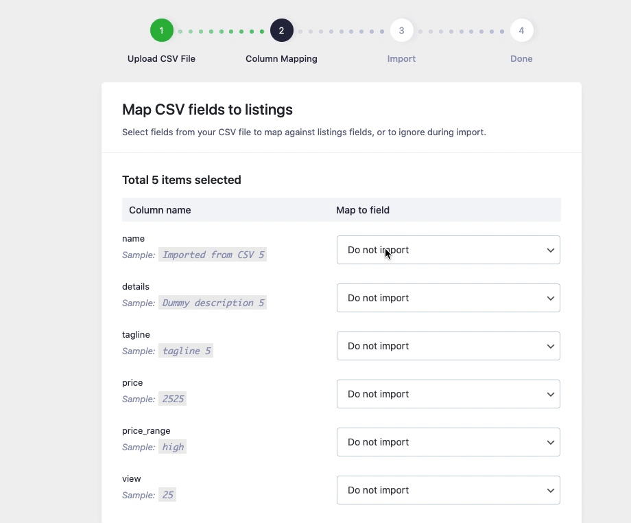 Step 2: In the next window, you will see the column mapping section wherein you need to map the CSV fields to the Directorist listing fields. The left column represents the CSV file’s field names and the right column Directorist field names. To map your CSV field, select the field from the field dropdown in the “Map to field” column.