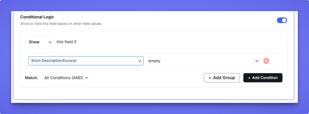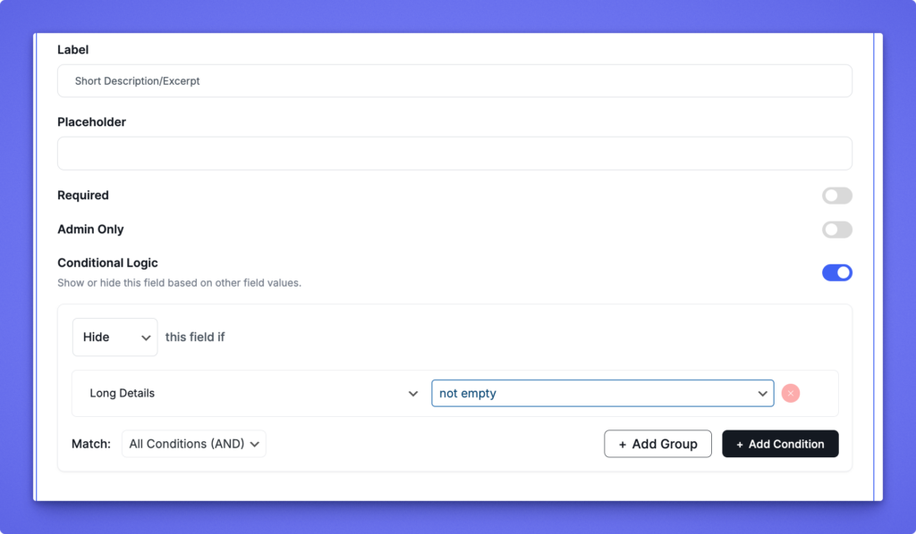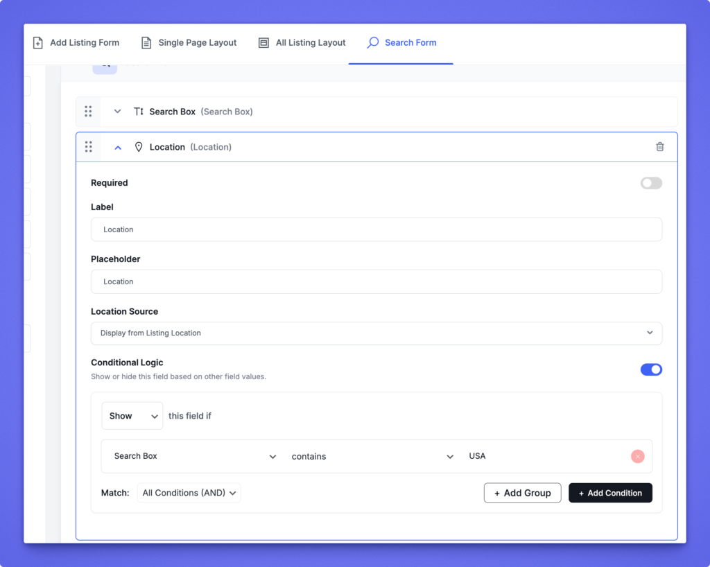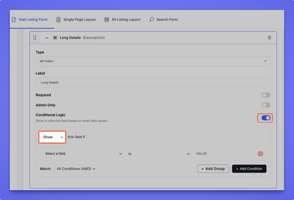 Conditional Logic works inside the Add Listing Form Builder and applies to frontend listing submission.