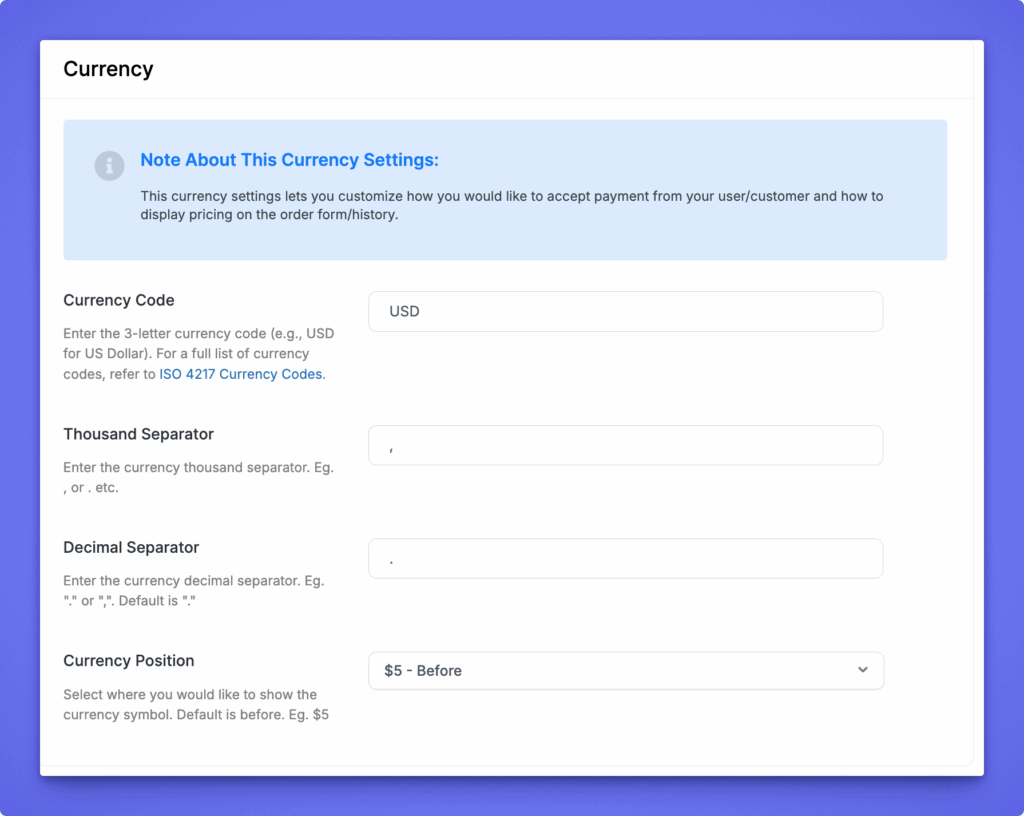 | Currency Position | Choose where the symbol appears — Before ($5) or After (5$). |